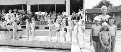 The picture on the left shows the children standing in line, waiting to use the diving board. The picture on the right is probably the Macduff family.